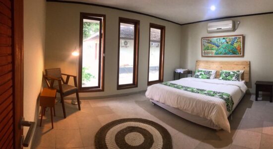Villa Rumah Putih – Garden View, Harga paket IDR 1.800.000/orang ( 1 room minimal 2 person) + ticket boat roundtrip weekday IDR 540.000/person and ticket boat roundtrip Weekend IDR 640.000/orang. Facilities inside of Villa : Double bed king size, Air condition, Water Heater Shower, Dispenser hot and cold, Coffee maker, Kids area, foyer, terrace, beach deck, Share kitchen with standard cooking tools and cutlery set. Amenities : Towels, Soap, Shampoo, Sarong Bali.